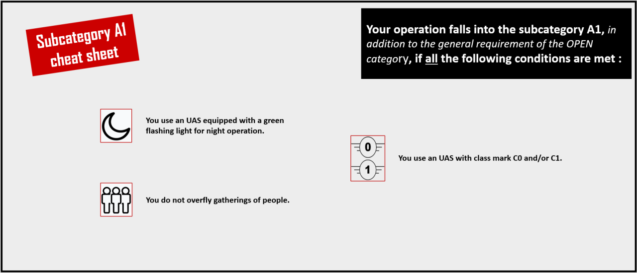 Please note that an UAS that is in a lighter category (e.g. Subcategory A1) is always accepted in a higher category (here Subcategory A2).